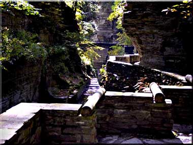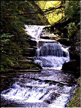 Enfield Glen waterfall. The stream wanders down past the Treman