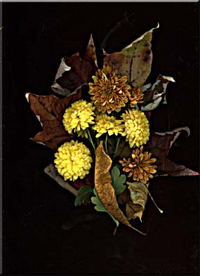 Fallen leaves arranged as a still life photograph. Flowering Dogwood bracts arranged in a layered composition. Photograph of Red Maple seeds arranged against gold-colored silk . Sunlit lily photographed against a dark background. A formal bouquet of dried leaves and chrysanthemums.